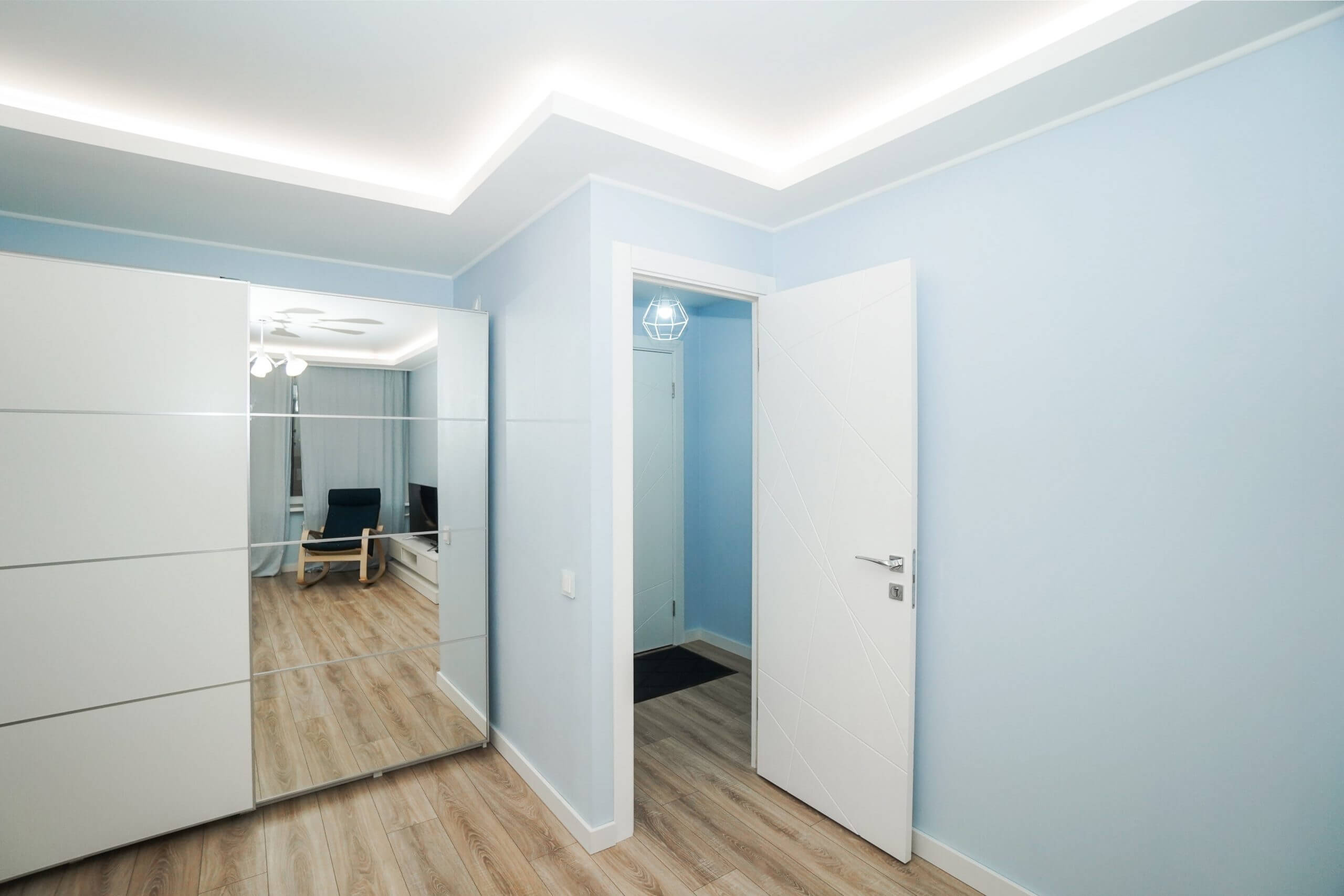 - Потолок натяжной со скрытыми карнизами.